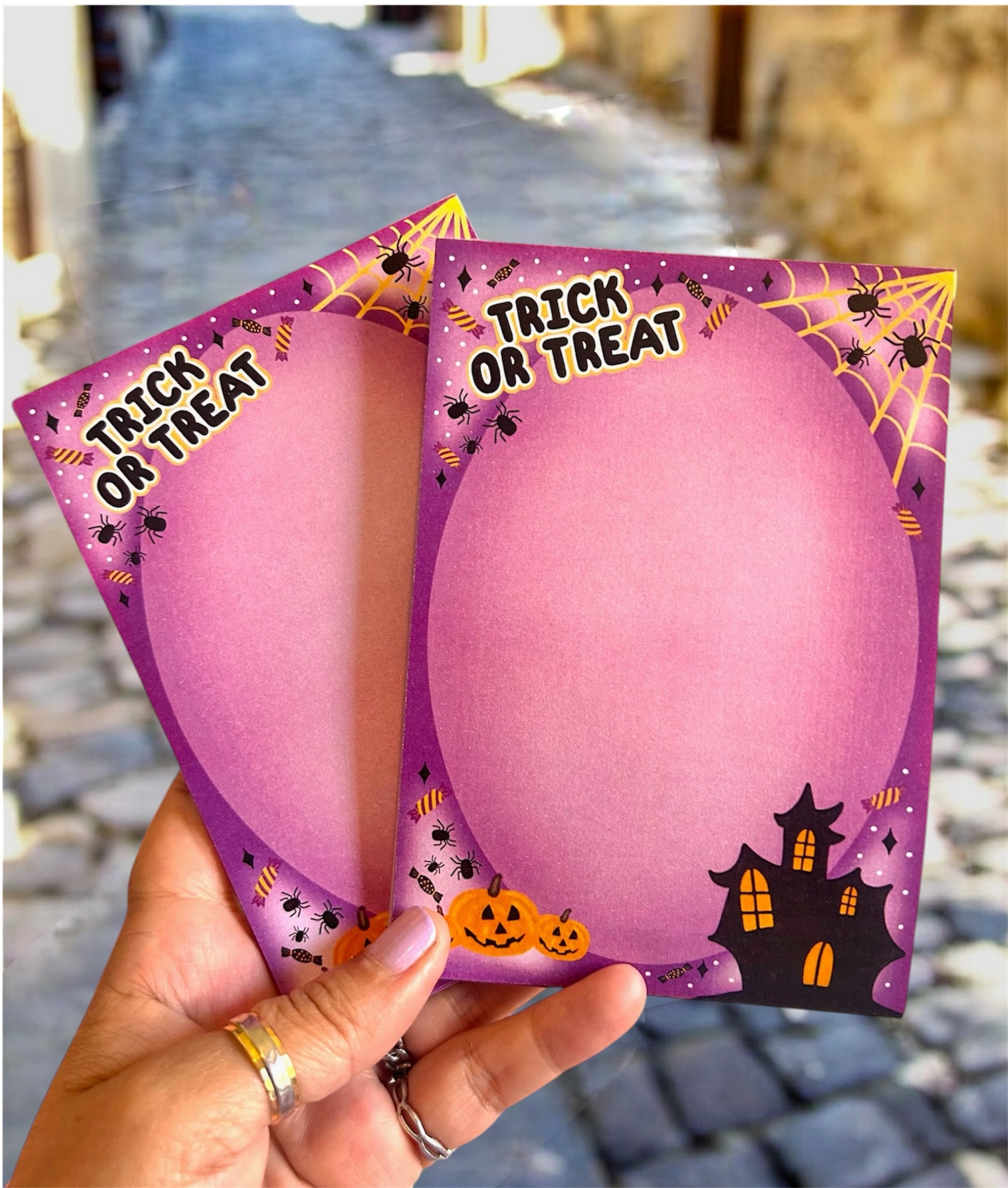 Halloween Trick or Treat A6 size notepads are here and look fantastic in Halloween themed designs in purple and orange tones with spooky illustrations. These notepads would make a cool gift for Halloween or just for yourself.